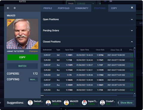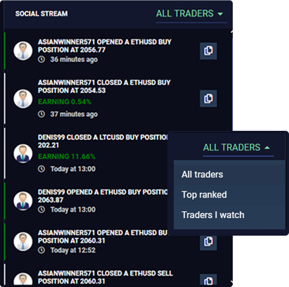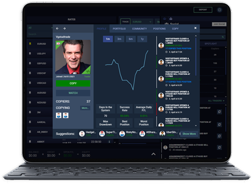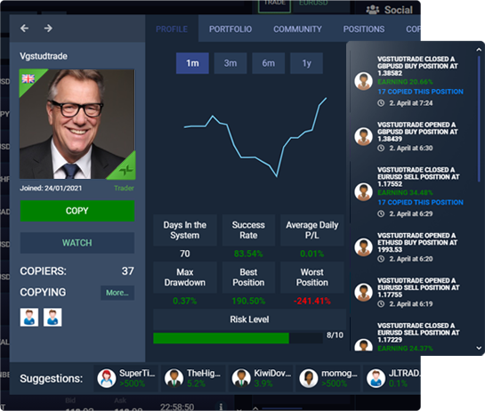 Social trading is fully integrated into our platform and offers access to the live trades of other investors allowing you to copy the positions opened and managed by these traders, with the option to disconnect copied trades and manage them individually.