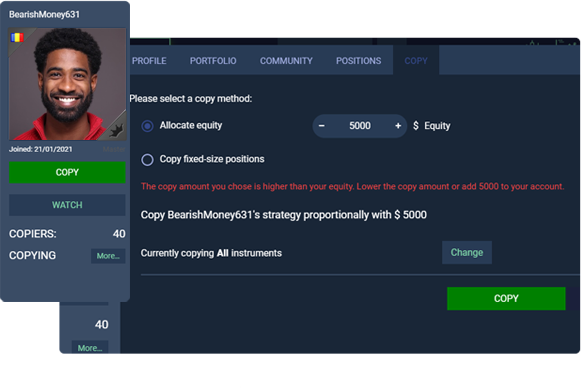 To automatically copy all of a trader’s trades (mirror trading), click on the “copy” button on their profile page. Two mirroring trading methods are available: